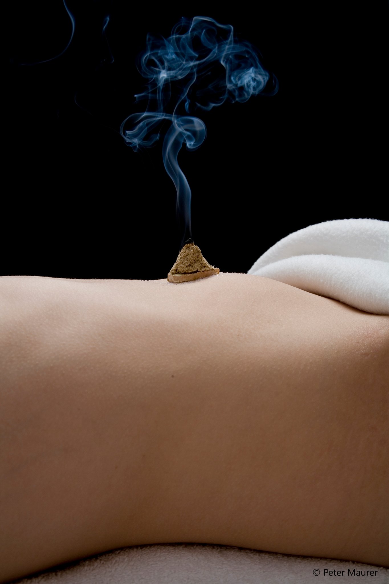 Bei Kältekonstitutionen werden den Nadeln kleine Moxa-Kegelchen aufgebracht und angezündet. Diese verursachen einen wärmenden Effekt der Stagnationen auflöst und vertreiben die Kälte. Moxa ist getrocknetes Beifusskraut (Artemisia vulgaris). Man kann es auch ohne Nadeln verwenden, dazu werden mit einer Moxazigarre entsprechende Akupunkturpunkte erwärmt.